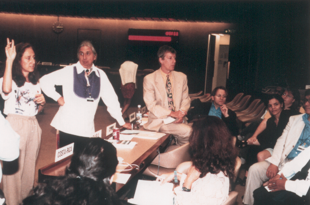 Julian Burger, Alfonso Martinez und Mary Robinson bei der Feier zum Indigenous Day bei der UN-WGIP in Genf (Foto: Oliver Kluge 2002)