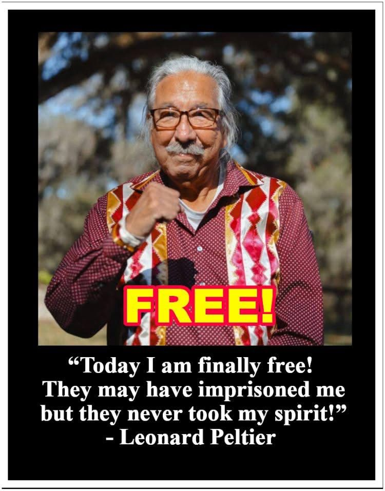 Peltier Free (NN, 2025) Mehr als 500 Unterstützer*innen, Freund*innen und Verwandte versammelten sich am 19.02.2025 im Sky Dancer Event Center auf der Turtle Mountain Indian Reservation, um Leonard einen fulminanten Empfang zu bereiten, darunter auch Filmemacher Chris Eyre und Kevin McKiernan, der schon die Indigenen bei der Besetzung von Wounded Knee 1973 unterstützt hatte. Mit Trommelklängen und Freudengesängen wurde Leonard begrüßt, bevor er sich erstaunlich rüstig und sichtbar glücklich für die Jahrzehnte der Unterstützung und Solidarität bedankte.