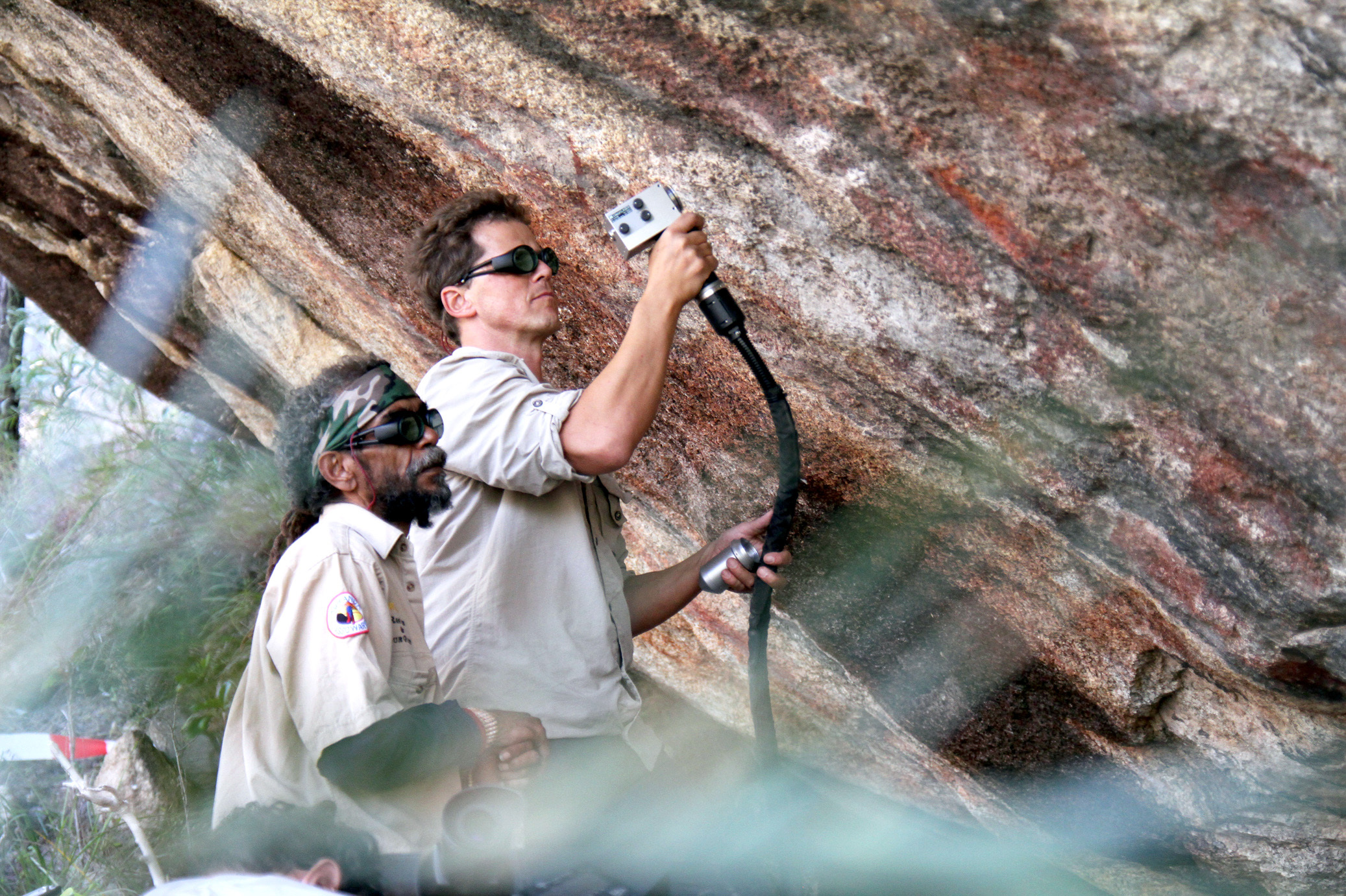 Steinrestaurator Jürgen Steiner und Bulwai-Ältester Willie Brim. Steiner restauriert das Weiße Känguru mit Lasertechnik (Foto: ORF/Gernot Stadler 2013)
